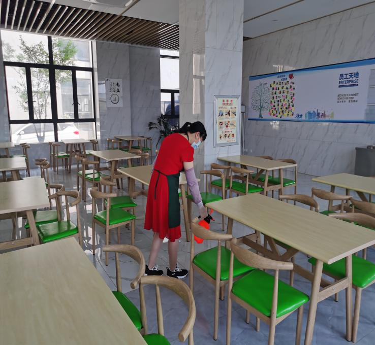 中午公司食堂就餐,安排餐前測溫,就餐期間一人一桌,不交流拉開吃飯的距離減少感染的機會。就餐結束,每位員工的餐盤自行帶回清洗消毒保管。