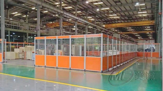 設(shè)備防護(hù)圍欄是在生產(chǎn)外設(shè)立防護(hù)措施,局部或全部建立鋁型材防護(hù)圍欄,以保證人員和設(shè)備安全,部分區(qū)域會安裝門或留出通道便于貨物進(jìn)出和人員檢修。
